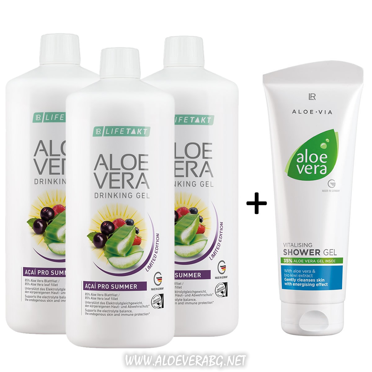 LR Гел за пиене Aloe Vera AÇAÍ PRO SUMMER за Защита от Слънцето и от Дехидратация, Троен Комплект + Витализиращ Душ-Гел Алое Вера