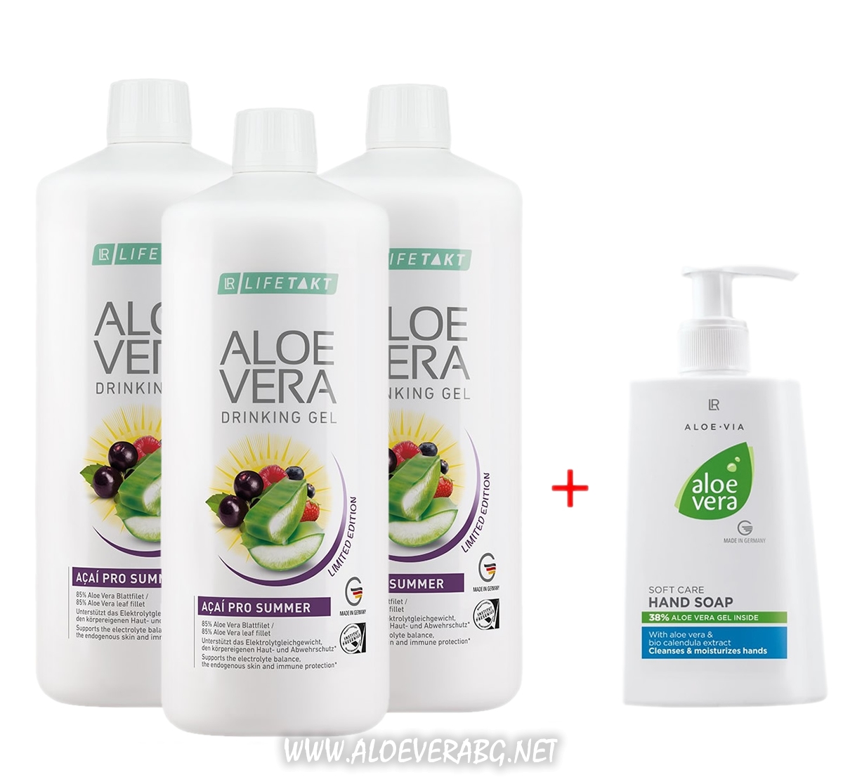 LR Гел за пиене Aloe Vera AÇAÍ PRO SUMMER за Защита от Слънцето и от Дехидратация, Троен Комплект + Нежно Почистващ Крем-Сапун за Ръце Aloe Vera