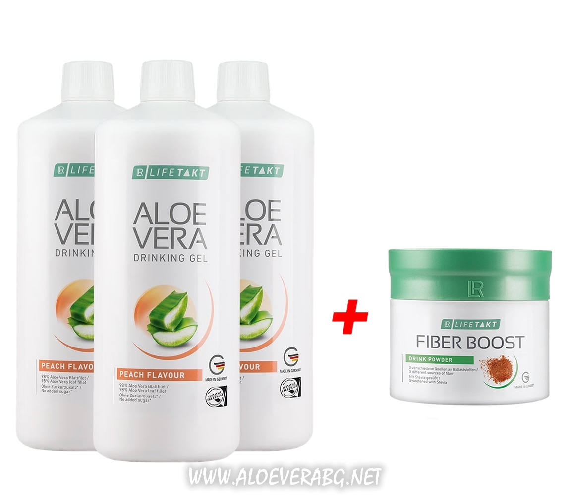 LR Алое Вера гел за пиене с праскова за диабетици, Месечен комплект + Fiber boost Фибри за По-слабо усещане за глад