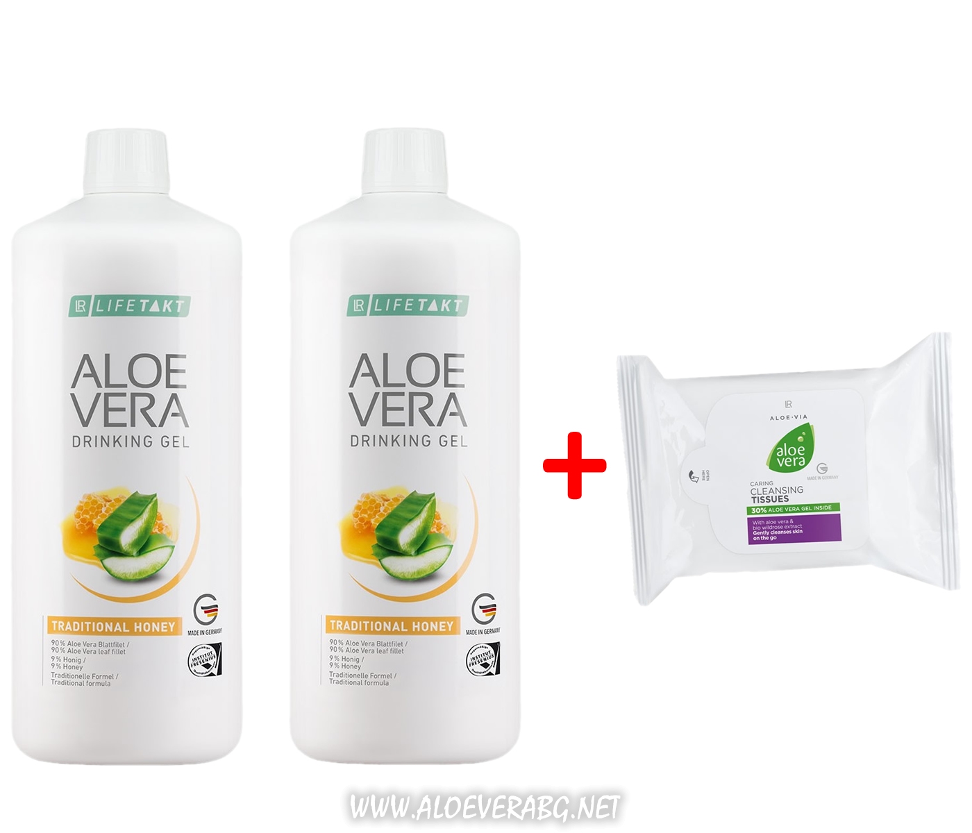 LR Гел за пиене Алое Вера с мед при стомашни проблеми | Двоен комплект + Нежни почистващи кърпички (Код: 80702-1)