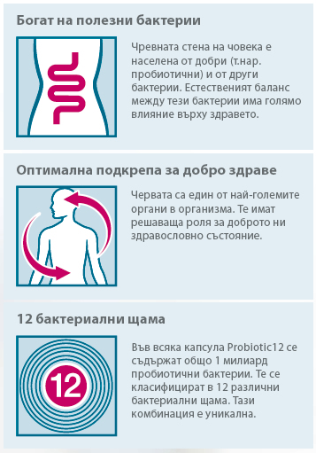PROBIOTIC12 съдържа пробиотични бактерии, като по този начин помага да се запази равновесието между "добрите" и "лошите" бактерии. Пробиотичните бактерии подобряват работата на червата, най-важният имунен орган на човека.