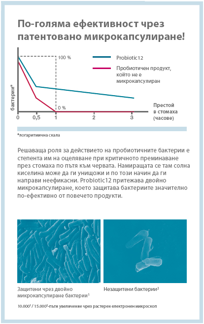 Това се осигурява от изключителната световна формула PROBIOTIC 12+ от LR. Чрез патентованите микрокапсули се гарантира оцеляването на един милиард бактерии в една капсула, разделени в 12 различни щама! Двойната микрокапсула осигурява сигурна защита при преминаването в стомаха. Следователно е напълно ефективна в чревния тракт.