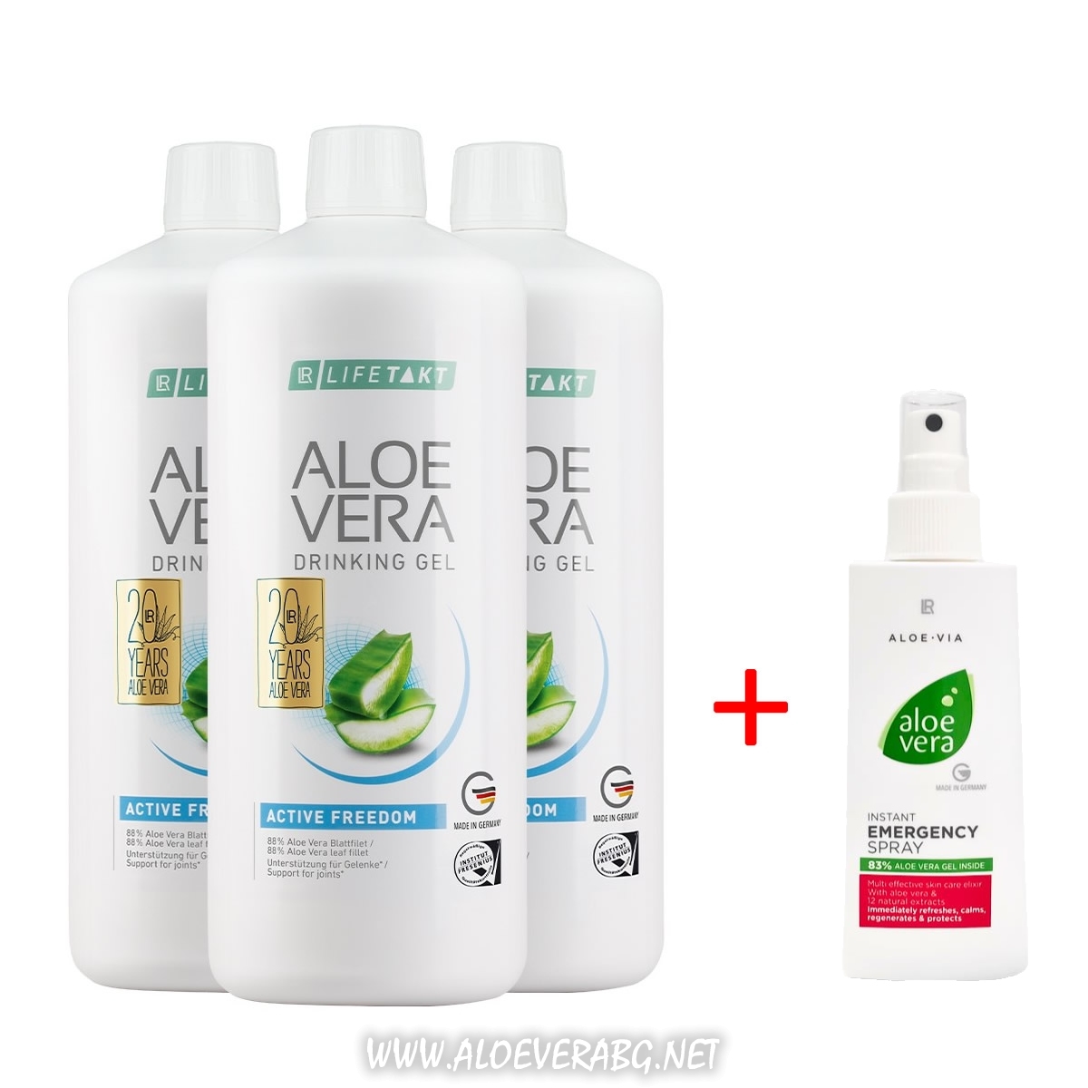 Комплект 3 броя Алое Вера Freedom с Колаген за Ставите + Спрей за спешна помощ при всякакви кожни проблеми (Код: 80883-20605)