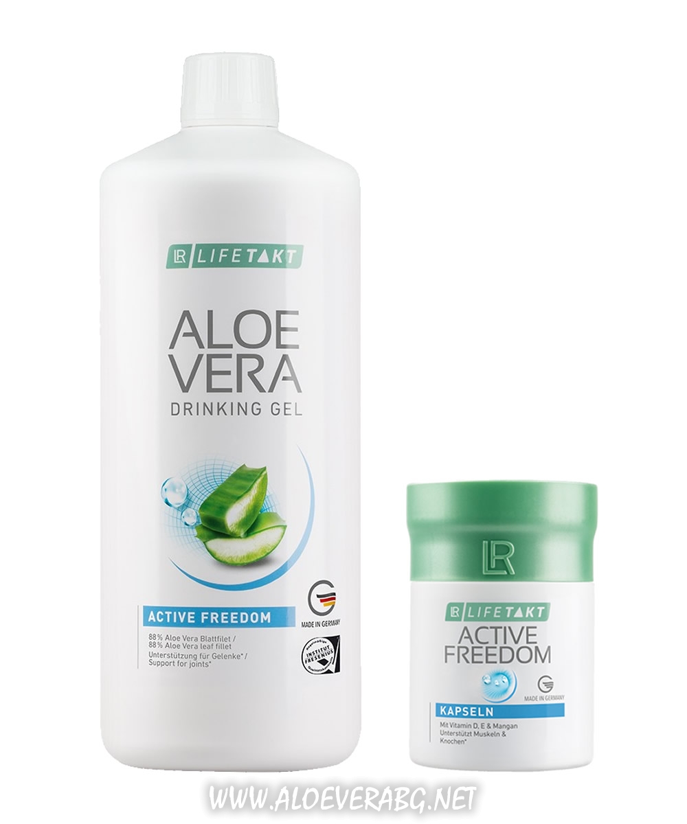 Комбинираната употреба на Freedom Plus и гела за пиене Алое Вера Active Freedom е активна програма за грижа и предотвратяване на симптомите на различните видове артрити. Препоръчва се за хора с висока физическа активност и спортисти, които натоварват ставите си, както и хора в напреднала възраст. Важно свойство на алоето е, че помага за усвояването на витамини Е и С. Абсорбцията се осъществява по-бавно и по този начин витамините остават за по-дълго в обръщение. Ето защо комбинацията от алое и витамин Е, влияеща на здравето на костите, е уникално съчетание, което се абсорбира по-добре по този начин. В САЩ сокът от алое се използва като тонизиращо средство и се смята, че помага при артрит.