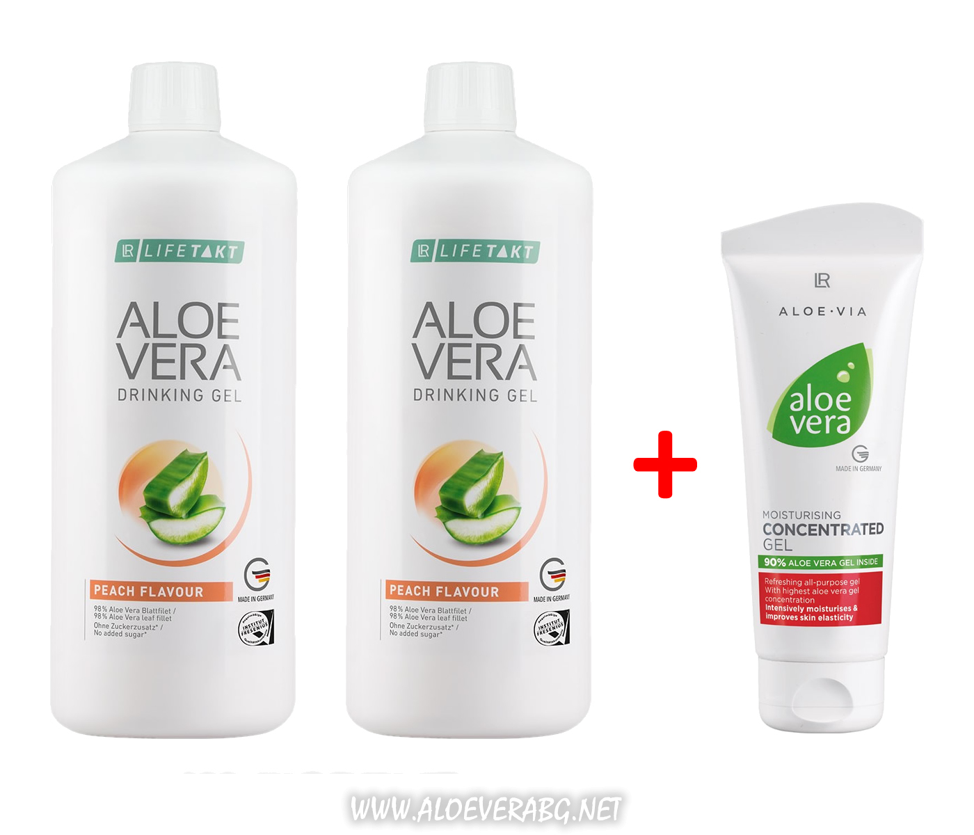 LR Комплект Aloe Vera Feel Good Гел за пиене с праскова за диабетици, две бутилки + Крем Концентрат Алое Вера при Кожни проблеми